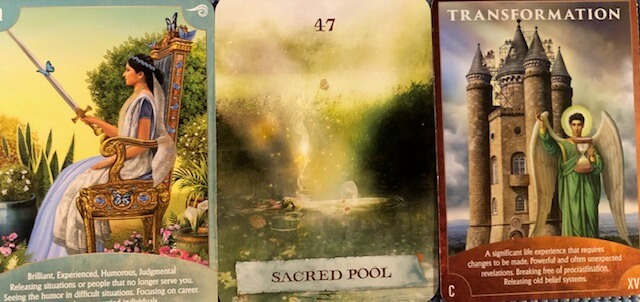 Kauriin ajalle 22.12.2025-19.1.2026 valikoitui kolme korttia: Radleigh Valentinen enkelitarotpakasta miekkojen kuningatar ja pakan alimmaisena ollut Transformaatio XVI sekä Colette Baron-Reidin MAP-oraakkelipakasta "Sacred pool" 17.